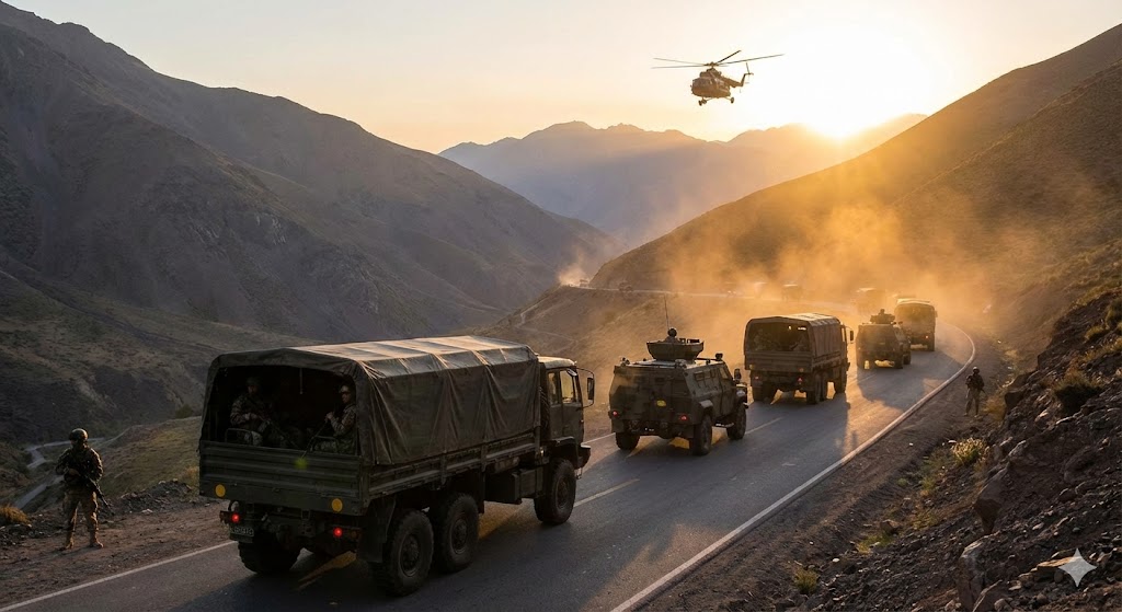 Caption: A military convoy moves the priceless artifacts from the remote mountain location under heavy guard.