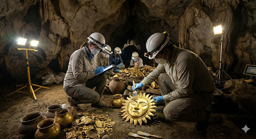 Caption: Archaeologists work tirelessly inside the cave, cataloging the immense hoard of Inca artifacts.