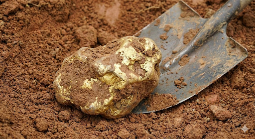 Caption: A large gold nugget, similar to the one reportedly found by Mr. T., sits in the reddish soil next to a shovel.